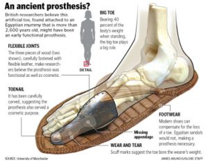 The story began with those who miss an essential part of themselves. It is a story of struggling to regain a wholeness that they have tragically lost. The earliest prosthetic is not a leg or a fake eye. It’s a toe, a big toe belonging to an Egyptian noblewoman living around 3000 years ago. Now, this may seem odd at first, a person can live without a big toe. But to Egyptian society, your big toe was important since wearing sandals was an important tradition, important enough to warrant the construction of this early prosthetic.