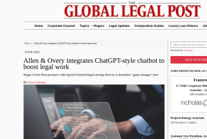 Magic Circle law firm Allen & Overy “partnered with a startup backed by ChatGPT creator Open AI to introduce a chatbot intended to help its lawyers with a variety of legal tasks”. Insisting simultaneously that their fees would not be lowered for customers. (!!!)