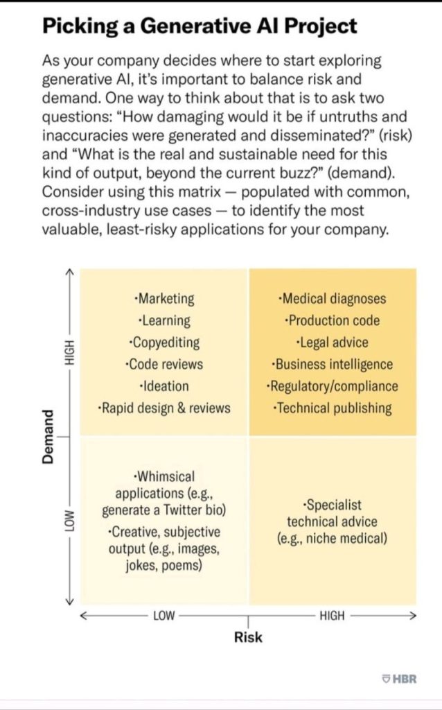 The following matrix by the HBR gives guidance to low and high demand and risk in using GenAI tools. You notice that most medium level but wide tasks are high on demand and low on risk. All skills requiring critical thinking, higher expertise, confidentiality, accuracy and veracity are in the high/high quadrant.